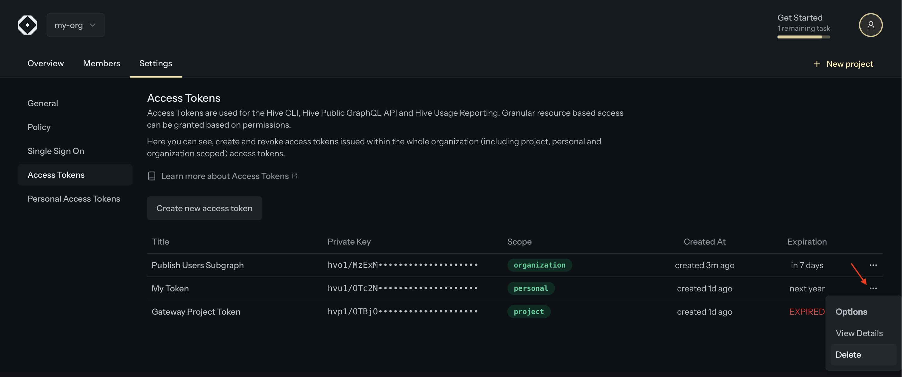 • Organization administrators can view and revoke all project access tokens from the organization settings.