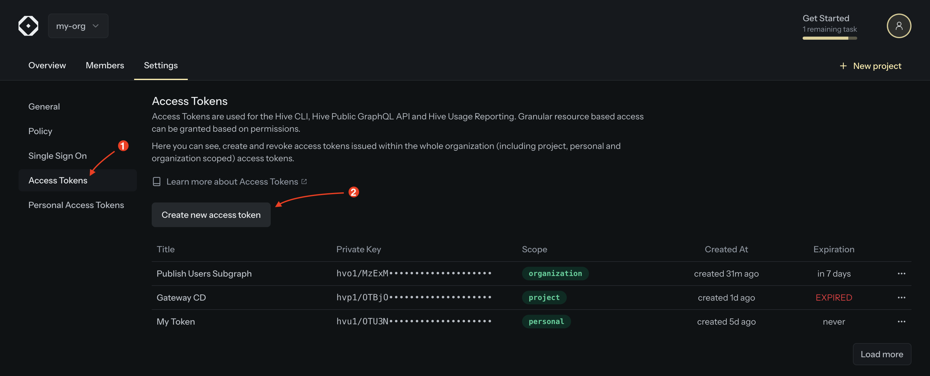 Go to the Settings tab of your organization and open the Access Tokens section.